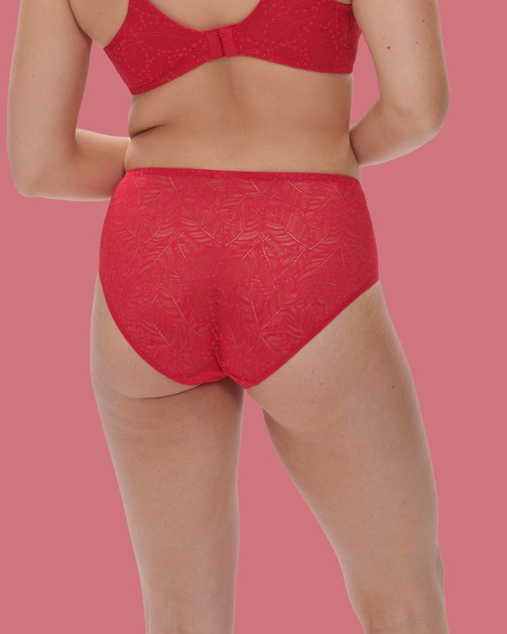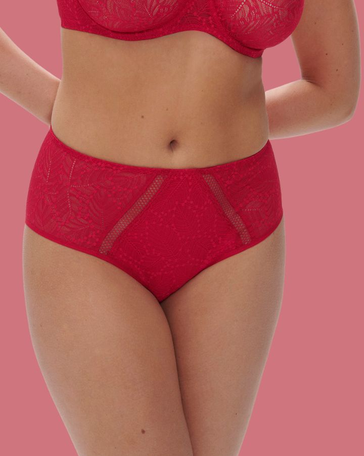 Culotte régulière, taille haute, tout en dentelle, jambes échancrées.