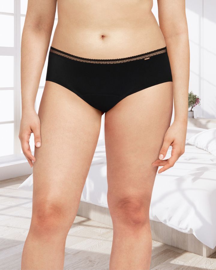 Culotte menstruelle ou pour fuite urinaire, taille basse avec dentelle sur le rebord. La culotte menstruelle (M) est une innovation éco-conçue qui allie confort, sécurité et féminité, faite de microfibre recyclée ultra douce, bande élastique à la taille, capacité d'absortion jusqu'à 4 tampons ou 12h, finitions contrecollées sans couture aux jambes, invisible sous les vêtements.