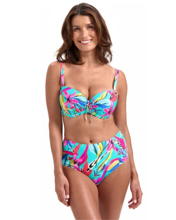 Ensemble bikini avec armatures, bonnets moulés avec fronces sur les côtés, bretelles ajustables, encolure coeur, laçet avec plumes métalliques décoratives pouvant être noué au cou ou simplement au milieu de la poitrine, culotte couvrante taille haute avec fronces sur les côtés.