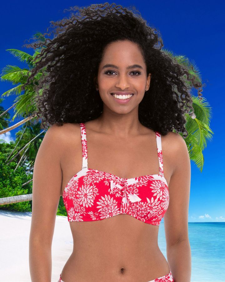 Ensemble bikini bandeau Paulina, avec profondeur de bonnets F, G, H et culotte ajustable sur les côtés, couleur canneberge et blanc.
