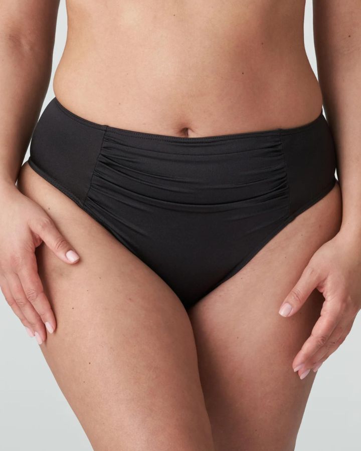 Culotte taille haute couvrante, panneau de maintien froncé, taille élastique, jambes légèrement échancrées.