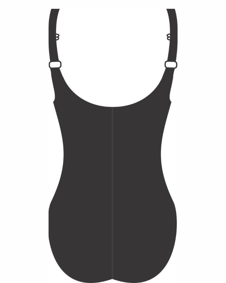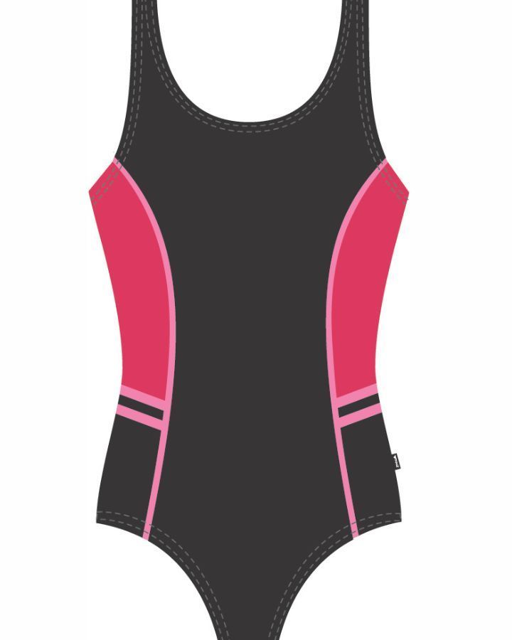 Maillot de bain une pièce devant fleuri et dos en V uni noir. Idéal pour la natation ou les cours d'aquaforme, 100% polyester, plus résistant au chlore.