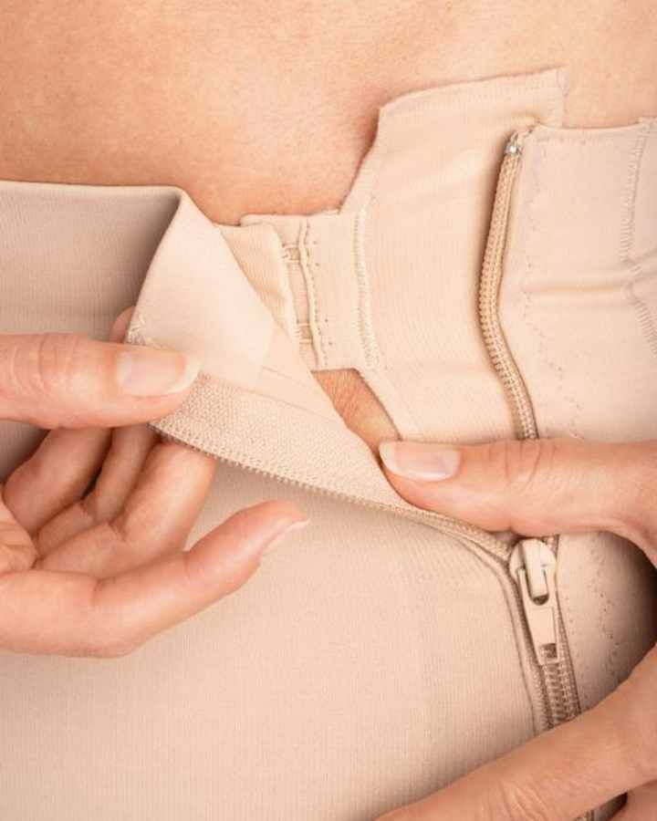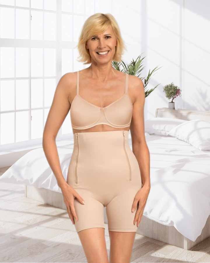 Ceinture contre-collée pour éviter les points de pression, finition par ultrasons à l'extrémité de la jambe pour le contrôle, 2 fermetures éclair pour faciliter la mise en place, compression ventrale, tissu respirant, certifié Oekotex.