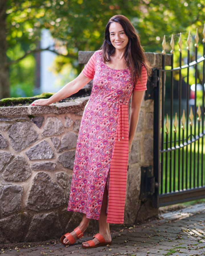 Robe longue Dalida pour la plage, encolure ronde, manches courtes, cordon de serrage sous le buste, fente sur un côté.