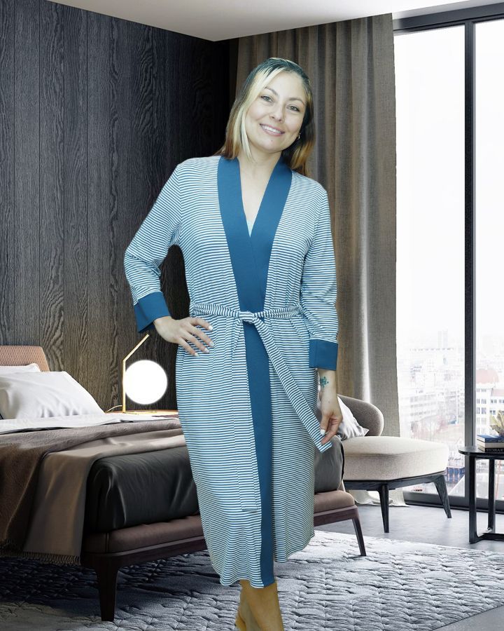 Robe de chambre mi-longue Serena, ceinture nouée à la taille.