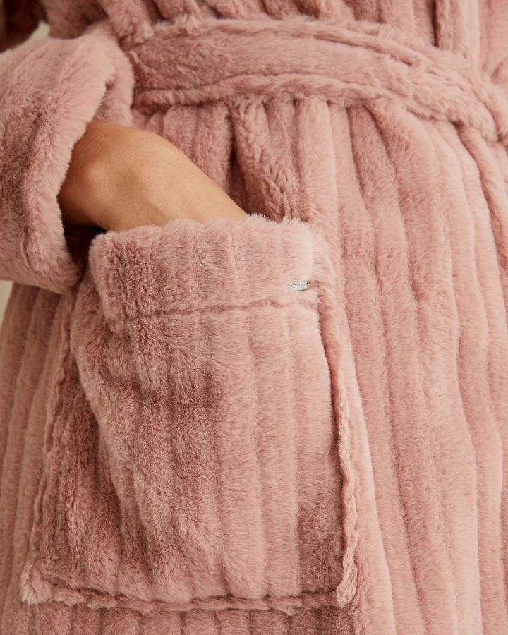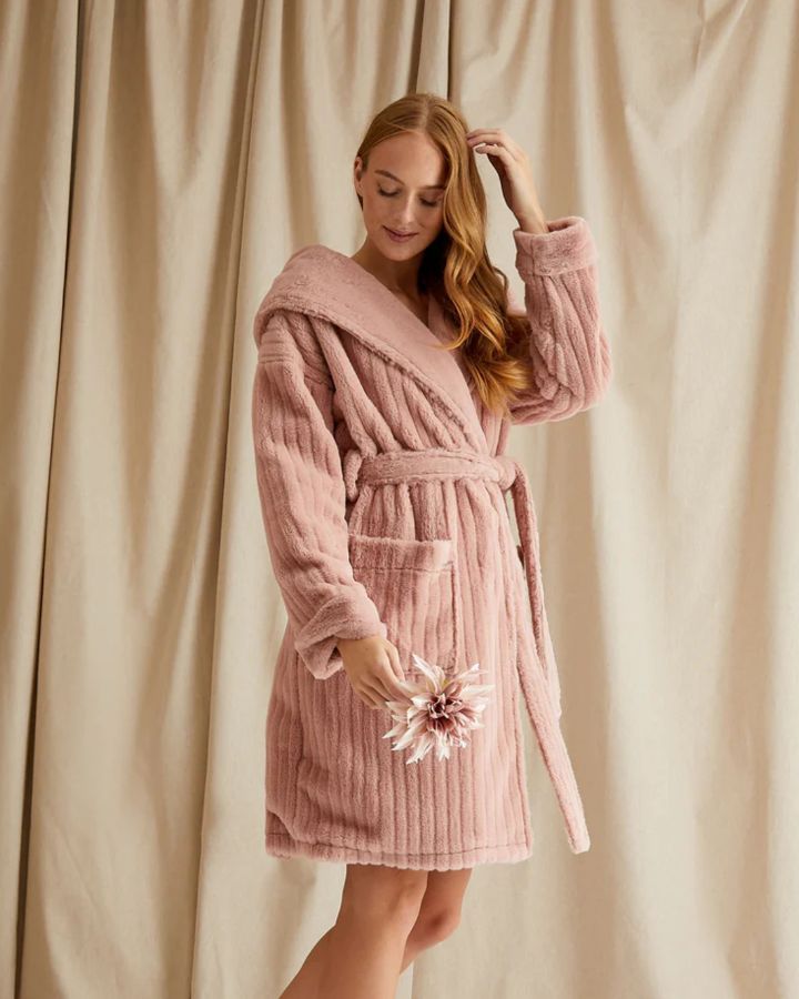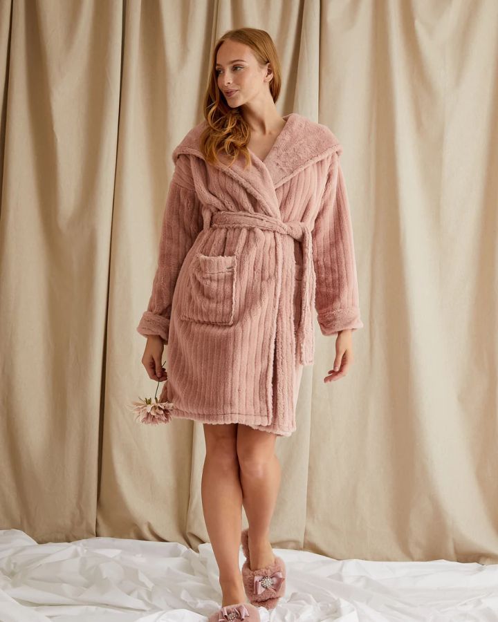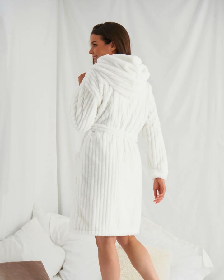 Robe de chambre courte en peluche nuageux, grand col châle avec capuchon, ceinture à nouer, manches longues, poches plaquées.