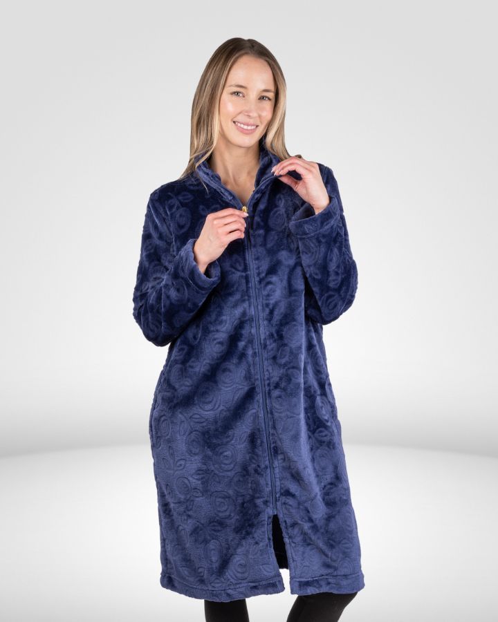 Robe de chambre courte, fermeture à glissière pleine longueur.