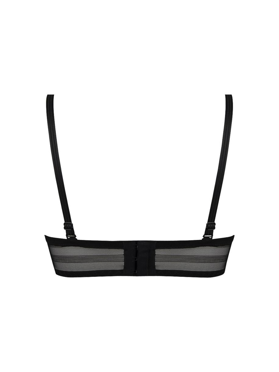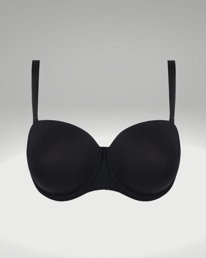 Soutien-gorge sans bretelle avec armatures, bretelles amovibles multipositions, bonnets moulés, tulle extensible sur les côtés.
