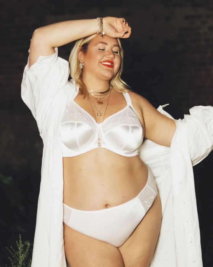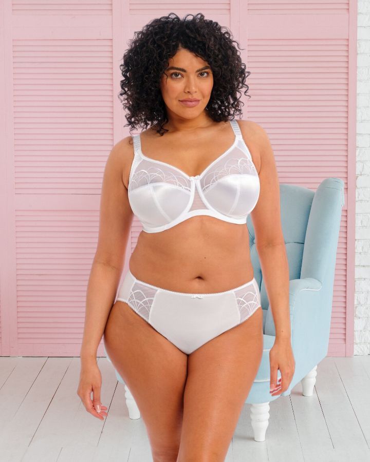 Soutien-gorge moulé avec armatures, bonnets en trois parties en satin doux, support latéral, broderie transparente.