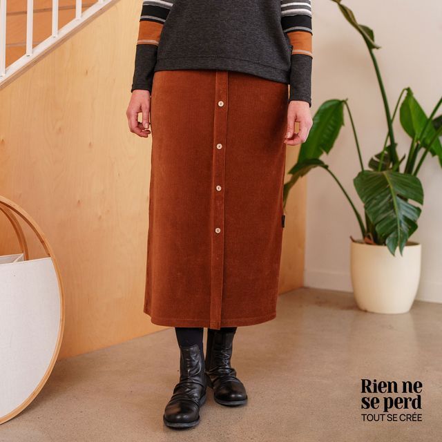 La jupe 7/8 pruche est un morceau intemporel pour les femmes de toutes les tailles et toutes les générations. C’est tout en charme et en douceur qu’elle traversera les années avec vous, l’emportant sur toutes les modes. Son tissu de corduroy souple est décoré de cinq boutons de noix de coco à l’avant et d’une fente au centre à l’arrière, un parfait équilibre entre style et confort pour faciliter vos enjambées. Avec sa longueur 7/8, cette jupe vous conviendra peu importe combien vous mesurez. Elle sera loin de toucher par terre. Donc que vous soyez grande ou petite, n'hésitez pas car vous tomberez définitivement en amour!
