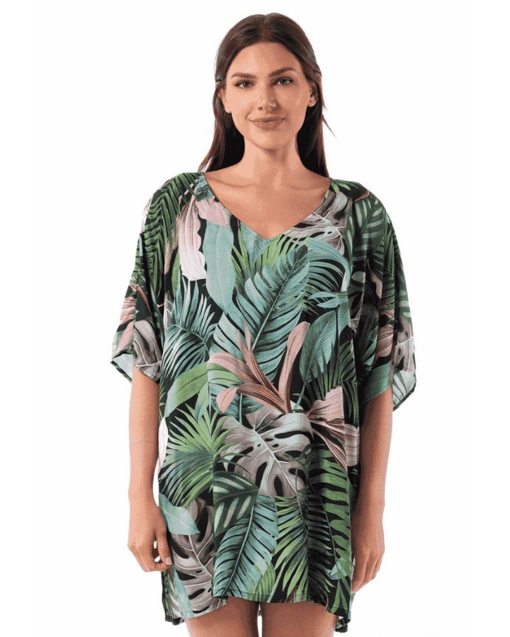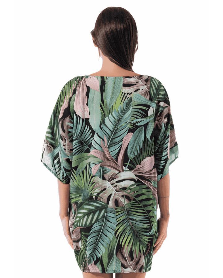 Mante de plage, longueur mi-cuisse, encolure en V, manches jusqu'aux coudes, tissu légèrement transparent.