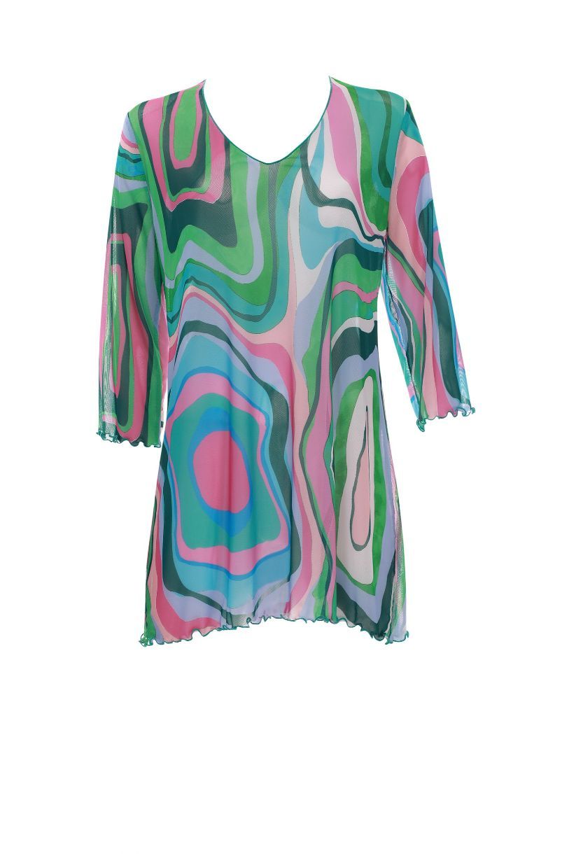 Mante de plage, encolure en V, tissu transparent, manches 3/4, longueur mi-cuisse.