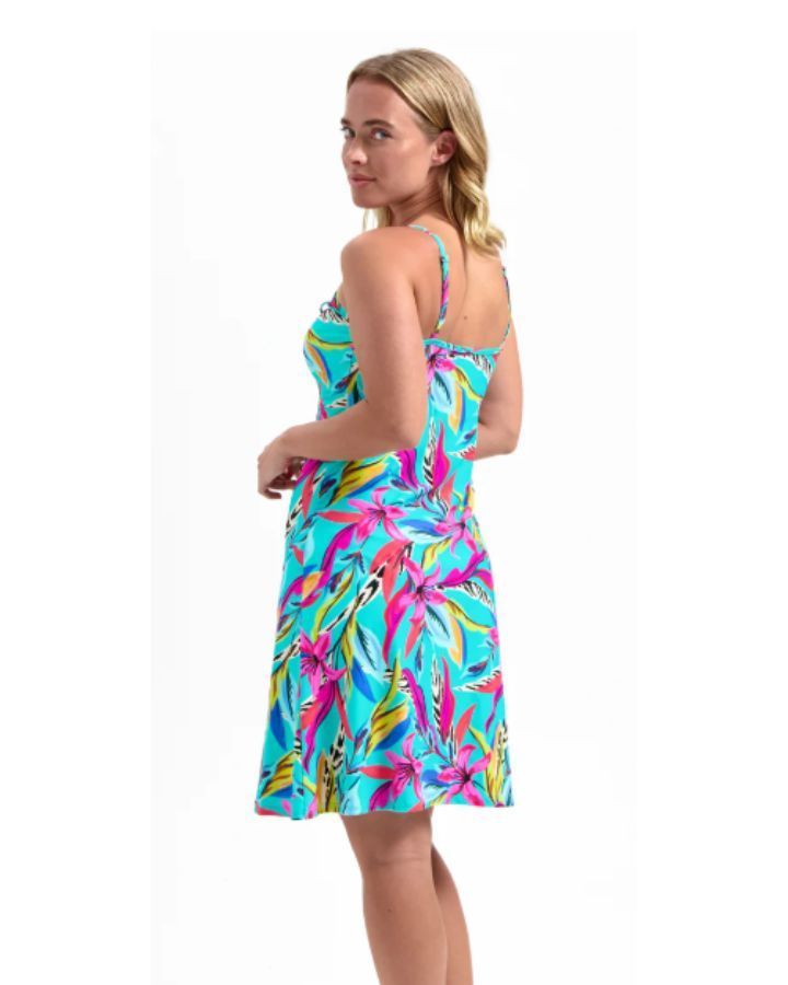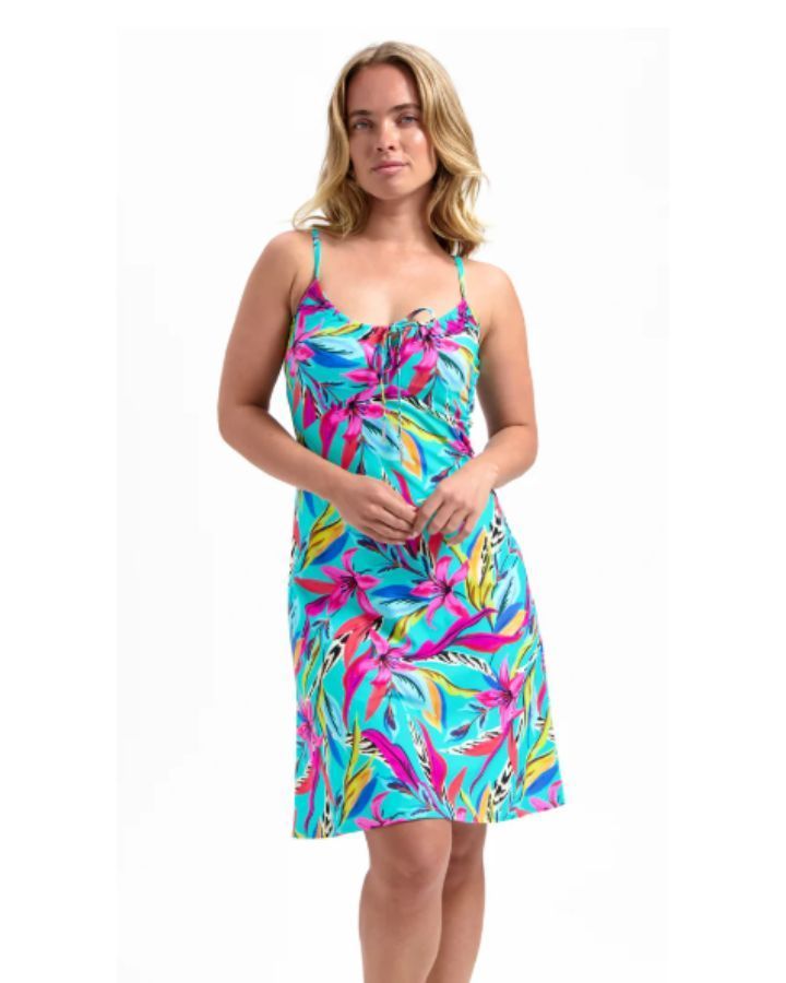 Robe de plage avec bretelles spaghetti ajustables, longueur au-dessus du genou, coupe ajustée au haut et plus ample au bas, laçet noué à l'avant au buste, doublure au niveau de la poitrine.
