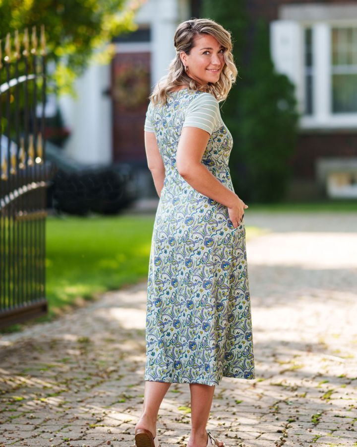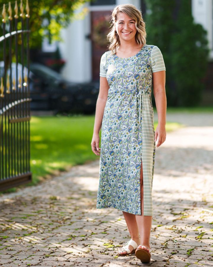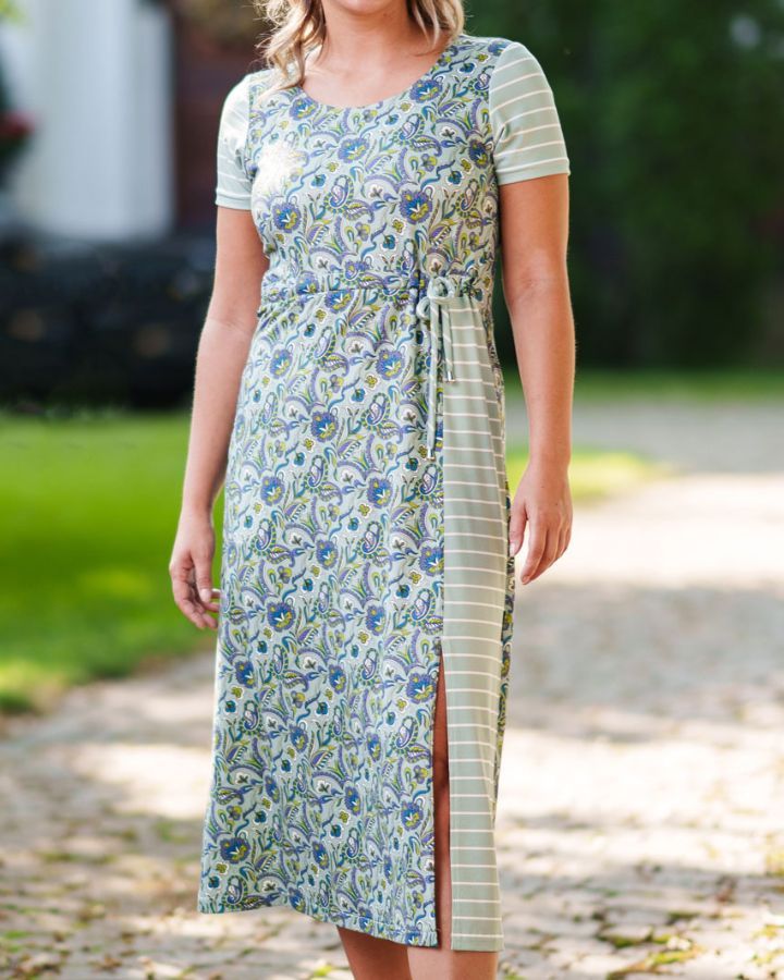 Robe longue Dalida pour la plage, encolure ronde, manches courtes, cordon de serrage sous le buste, fente sur un côté.