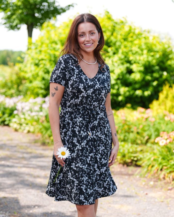 Robe mambo à manches courtes, taille empire ajustable, encolure en V, ruban noir orné d’embouts décoratifs ajustable à la taille, longueur au-dessus du genou.
