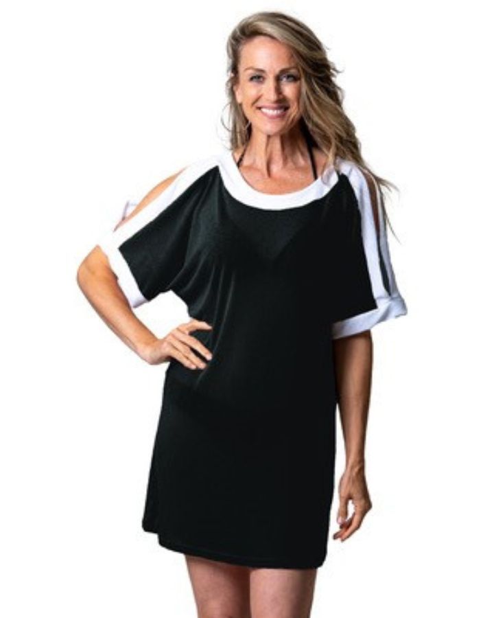 Tunique couvre maillot, longueur mi-cuisse, manches courtes avec fentes, encolure en U, légèrement transparent, coupe ample.