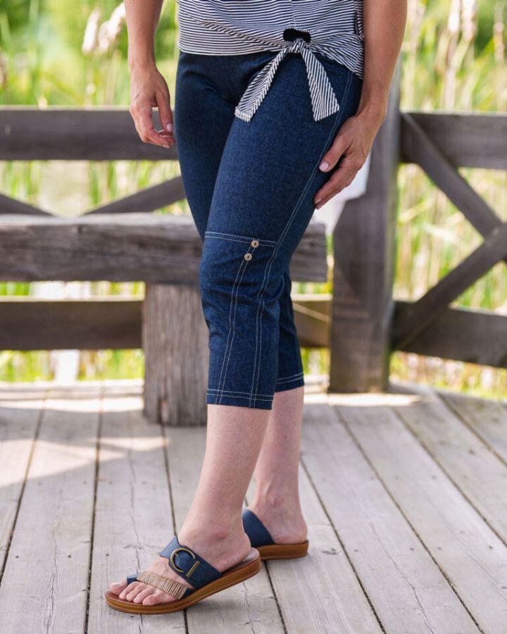 Capri lindy avec découpe et fils contrastés au bas, bande de taille large flatteuse, deux boutons de noix de coco sur chaque jambe, coupe ajustée.