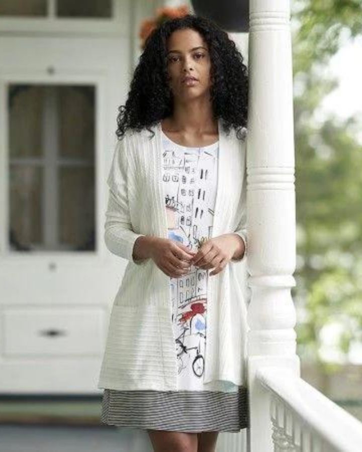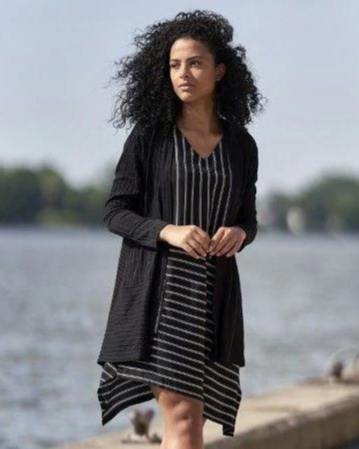 Veste Distinguée, ouverte, poches plaquées, manches longues.