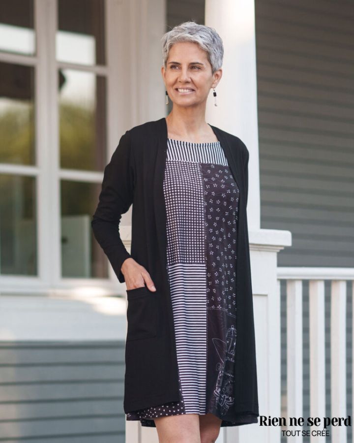 Veste Pétunia, longueur au genou, ouverte, manches longues.