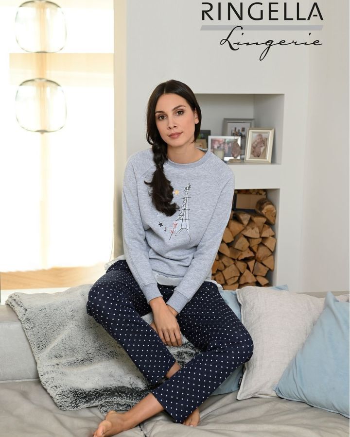 Ensemble pyjama long, chandail manches longues, encolure ronde, imprimé sur la poitrine; pantalon droit, imprimé petits pois.