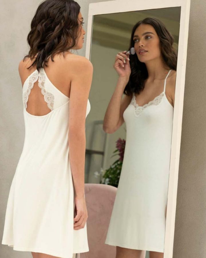 Nuisette, bretelles fines ajustables avec large croisé au dos, longueur mi-cuisse.