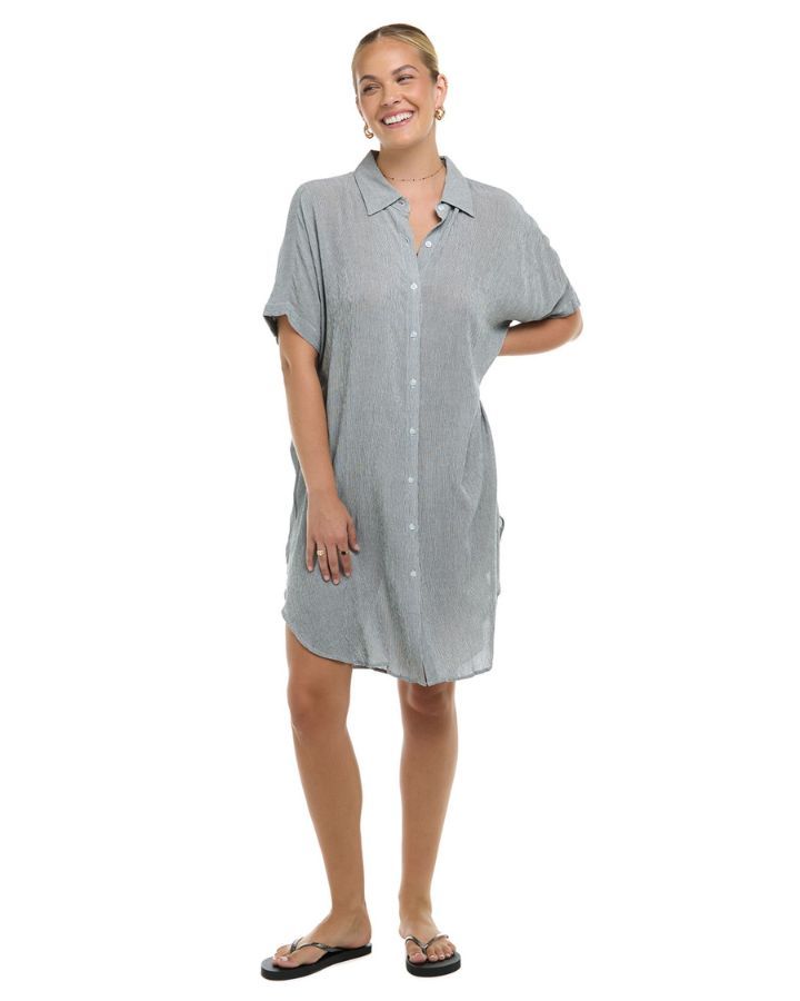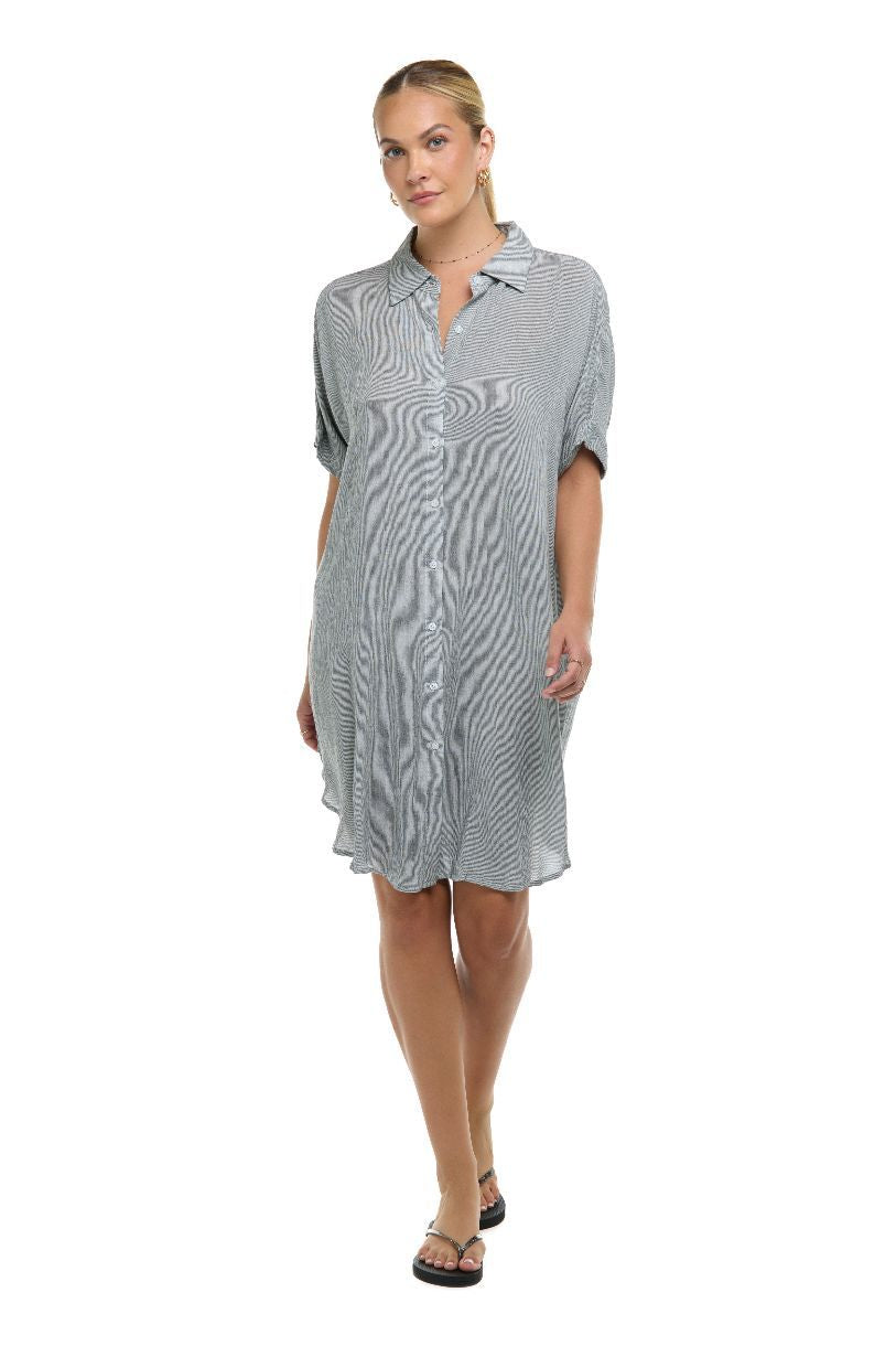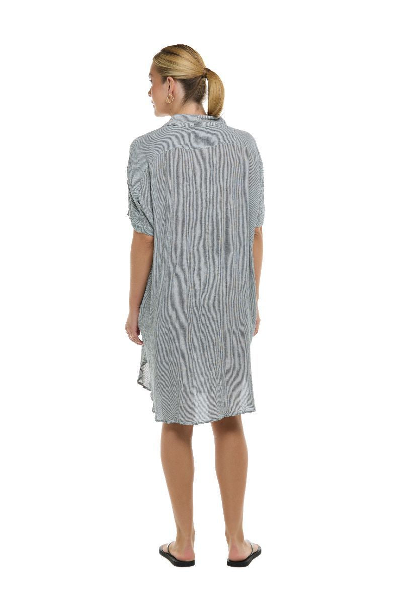 Robe style chemise, col chemisier, manches courtes tombantes, boutons au milieu à l'avant, longueur au-dessus du genou, couple ample.