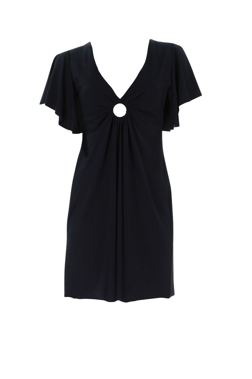 Robe de plage, manches courtes à volants, encolure en V, anneau au milieu, longueur mi-cuisse.