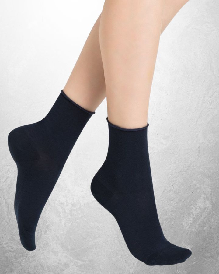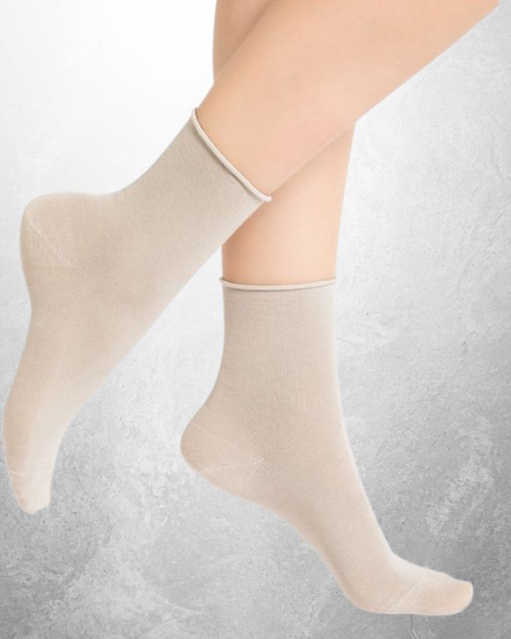 Chaussette sans élastique, bord roulotté non-comprimant.