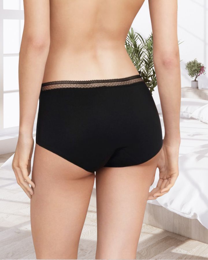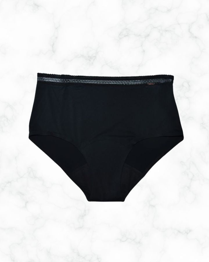 Culotte menstruelle ou pour fuite urinaire, taille haute avec dentelle sur le rebord. La culotte menstruelle (M) est une innovation éco-conçue qui allie confort, sécurité et féminité, faite de microfibre recyclée ultra douce, bande élastique à la taille, capacité d'absortion jusqu'à 4 tampons ou 12h, finitions contrecollées sans couture aux jambes, invisible sous les vêtements.