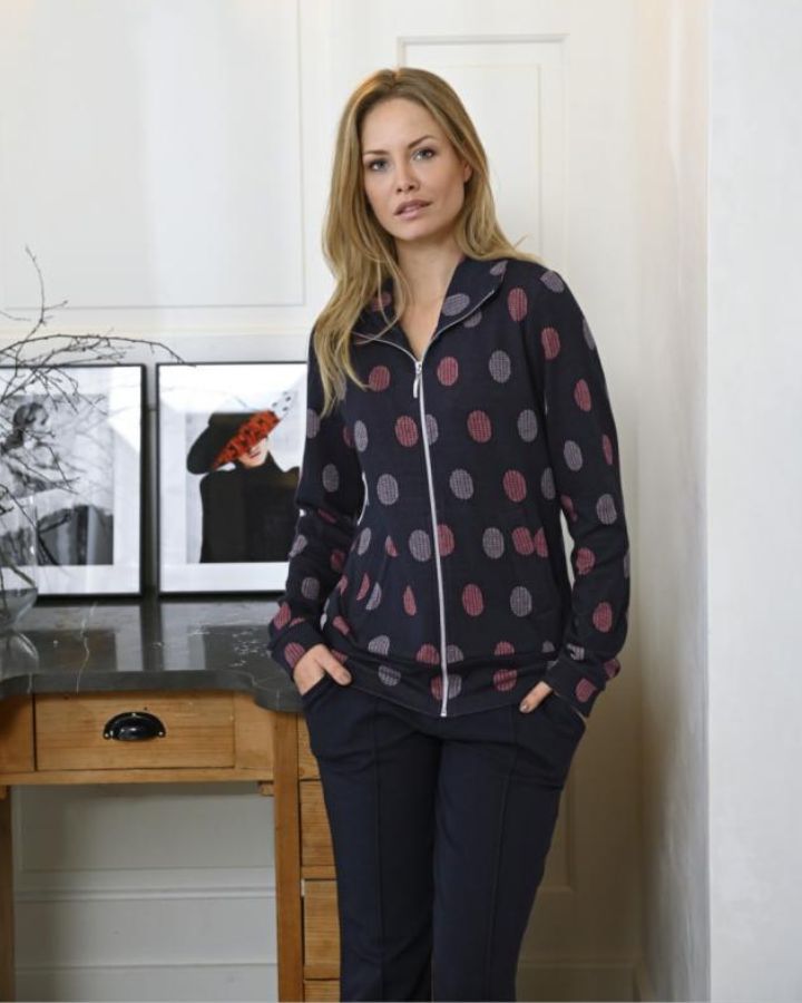Ensemble d'intérieur 2 pièces, veste manches longues, col cranté, fermeture à glissière pleine longueur, poches sur les côtés; pantalon droit, poches plaquées.