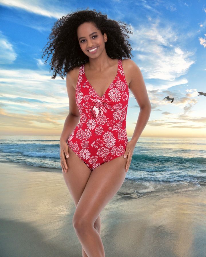 Maillot 1 pièce, noué au buste, échancré, décolleté en V.