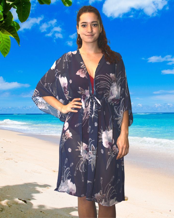 Mante de plage style kimono, col en V plongeant, tissu transparent.