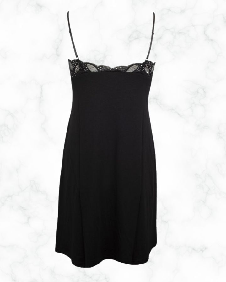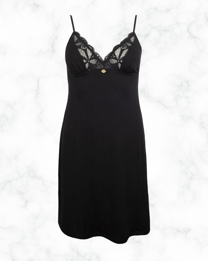 Nuisette courte, fines bretelles, empiècement de dentelle au décolleté en V.